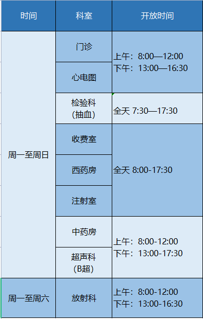 从11月15日起,我院下午门诊将提前至13:00开始看诊,各科室上班时间如下: